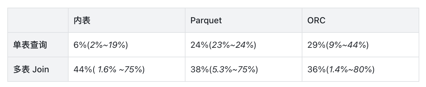 数据表明,TopN 优化在多种数据格式与查询模式下均能显著提升性能。平均可降低查询时间 30% 至 40%,在部分多表关联场景中,性能提升幅度最高可达 80%,效果尤为突出。这证明了两阶段访问机制有效减少了不必要的 IO,在不同存储格式和复杂查询中均能带来可观的收益。