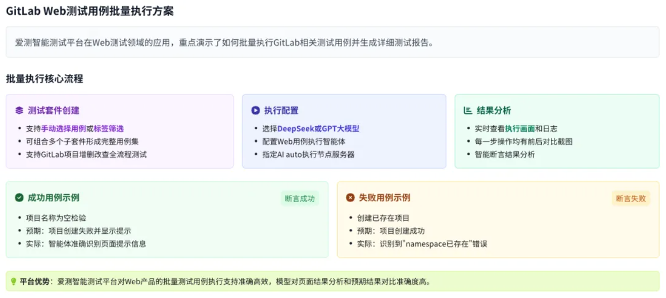 围绕这些问题,测吧(北京)科技有限公司 自主研发了 爱测智能测试平台,并在实际项目中落地了一套 “GitLab 用例 + AI 批量执行” 的工程化方案。