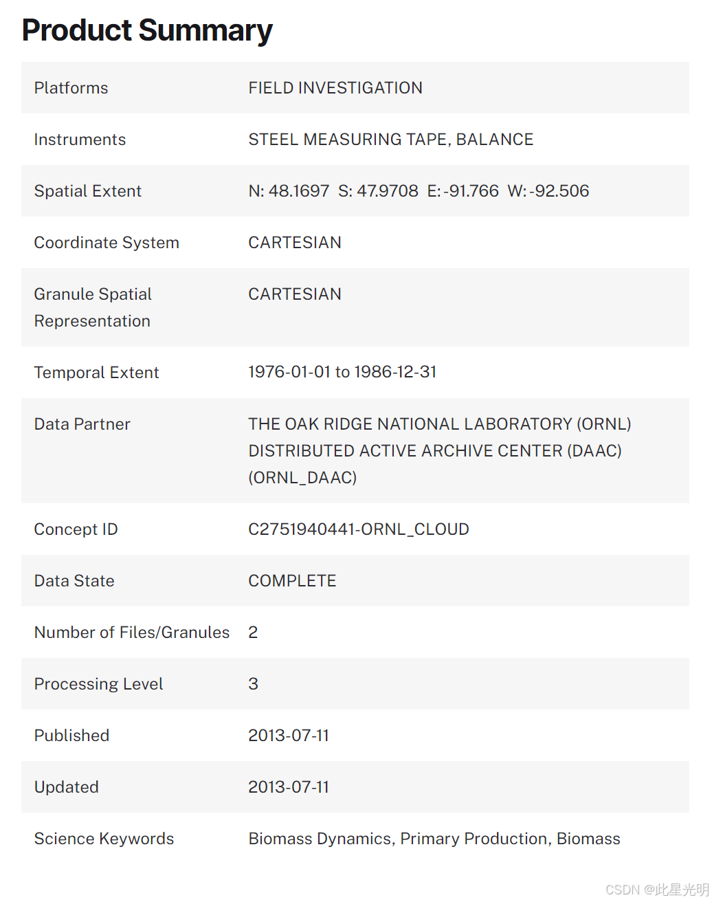 该数据集包含两个文件(.txt 格式)。其中一个文件提供了美国明尼苏达州东北部苏必利尔国家森林(Superior National Forest,简称 SNF,位于西经 92 度,北纬 48 度)内 31 个黑云杉(Picea mariana)林分和 30 个颤杨(Populus tremuloides)林分的地面生物物理测量数据和地上净初级生产力(ANPP)估算值。这些测量数据是在 1983-1984 年的密集野外调查期间获得的。在覆盖 50 x 50 平方公里区域的 100 多个森林样地中进行了非破坏性测量。用于生物量和年增长量测量的树木取自样地外。第二个文件提供了 1976-1986 年期间附近气象站的气候数据。