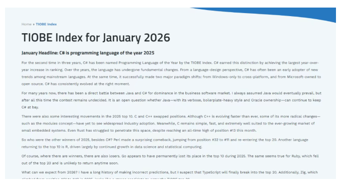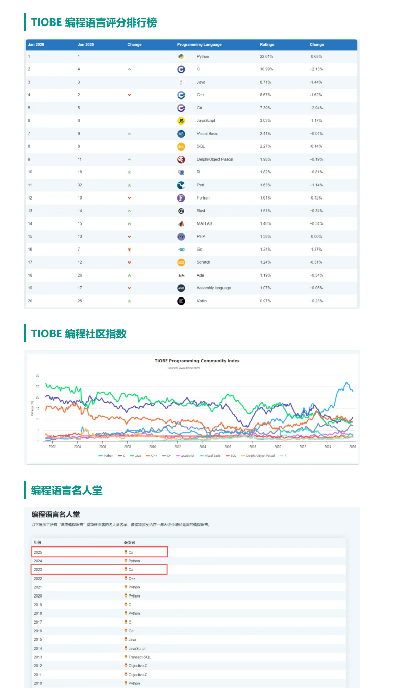 TIOBE 公布的数据显示,C# 以 2.94% 的年度最大涨幅再度获评2025 年度编程语言,在近三年内,C# 第二次被 TIOBE 指数评为年度编程语言。这一荣誉授予了在年度排名中涨幅最大的编程语言,而 C# 正是凭借这一最大增幅获此殊荣。