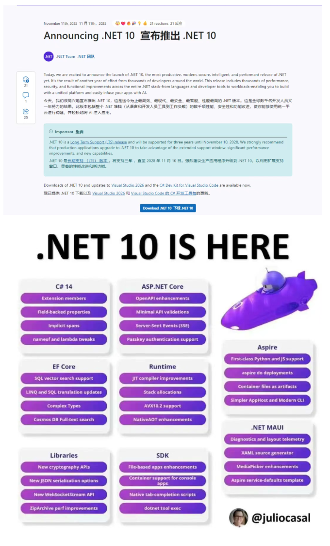 .NET 团队于 2025 年 11 月 11 日宣布 .NET 10 正式发布,这是迄今为止最高效、最现代、最安全、最智能且性能最高的 .NET 版本。
