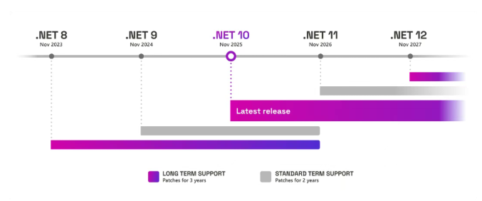 .NET 10 是一个长期支持版本(LTS) ,将支持三年 ,直至 2028 年 11 月 10 日。我们强烈建议生产环境中的应用程序升级到 .NET 10,以便享受更长的支持周期、显著的性能提升以及众多新功能。