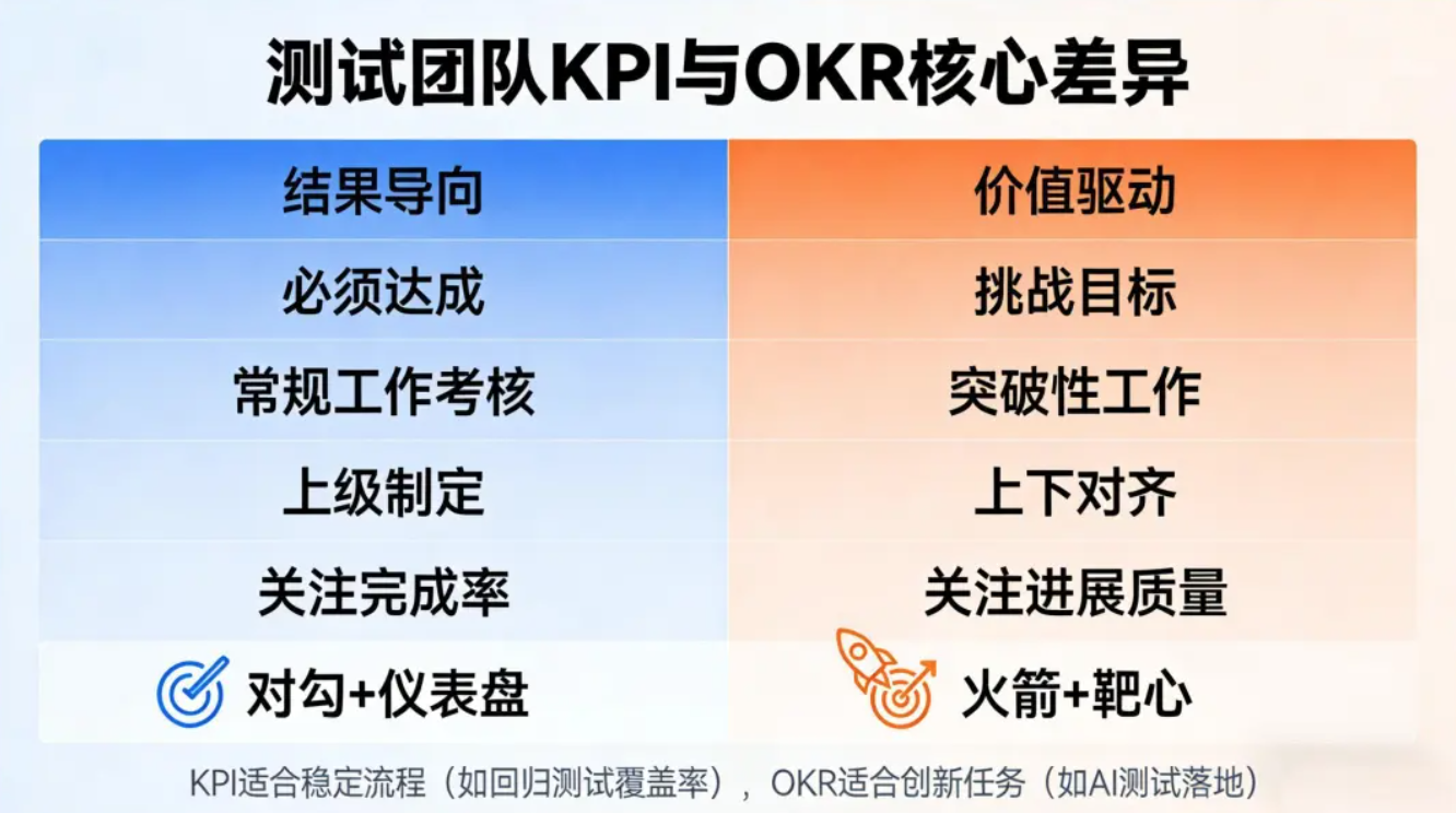 很多测试团队推OKR失败,要么是把OKR当成“KPI的变种”,要么是目标定得太模糊、太宏大,最后不了了之。作为带团队多年的管理者,我认为OKR的核心价值,是“让团队目标对齐、让每个人的工作有方向”,尤其适合测试团队——既要支撑业务迭代,又要兼顾技术沉淀(自动化、AI测试等)。