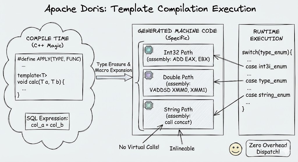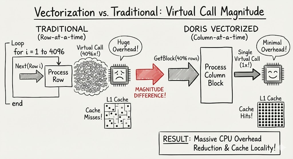 挑战是明确的:如何消除虚函数和分支预测带来的开销?如何让内存访问模式更适配 CPU 缓存?如何在高并发下避免锁与调度成为瓶颈?Doris 的应对策略清晰而系统: