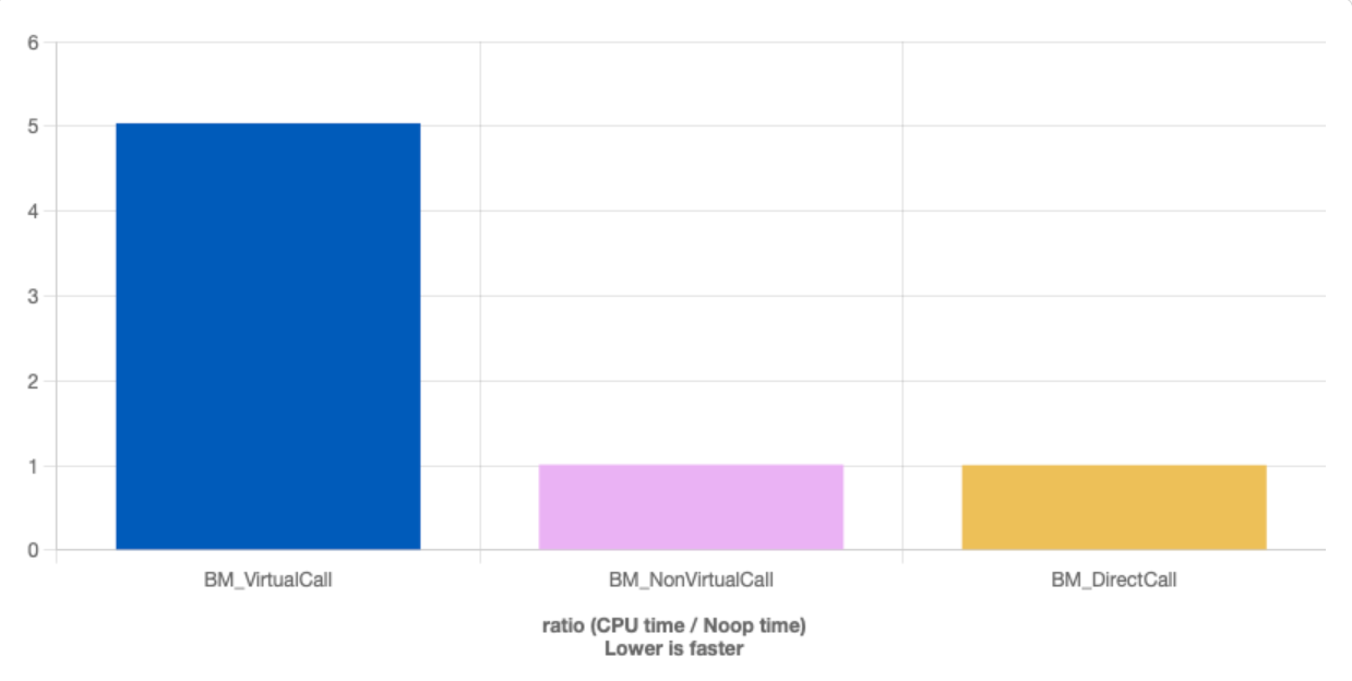以上结果产生自 Clang++ 17.0 -O3 -std=c++20 条件下的测试,可以看到,虚函数调用导致了普通函数 5 倍的性能开销。