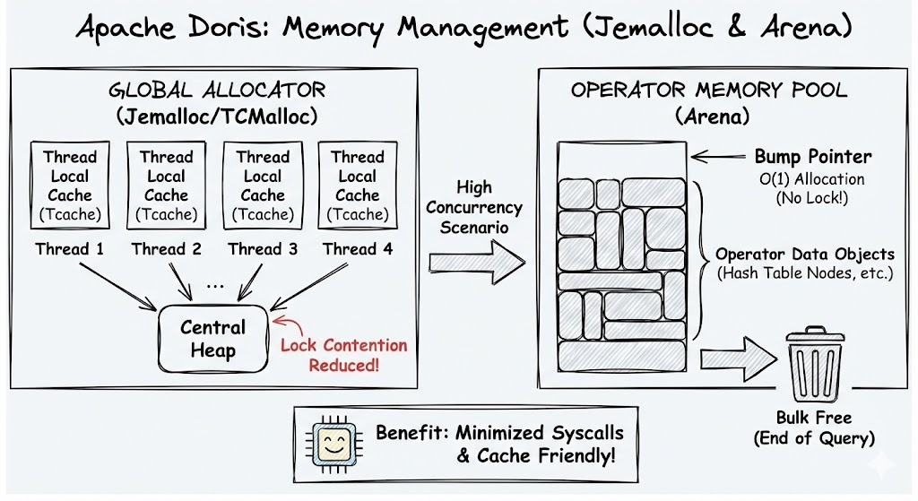 但在查询执行内部,Doris 并没有止步于此。在执行算子(如 Hash Join、Aggregation)时,Doris 使用 Arena(区域内存池)模式,这是因为很多对象的生命周期和“查询”绑定,完全可以在查询结束时统一回收。这直接带来了若干收益: