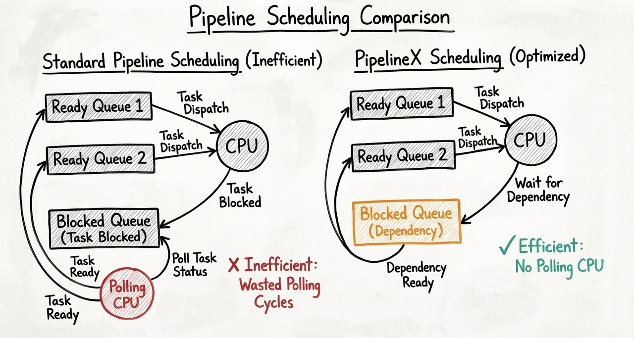 - 就绪队列(Runnable Queue):一旦数据就绪,依赖被满足,Task 转移至就绪队列。可以随时被调度执行。