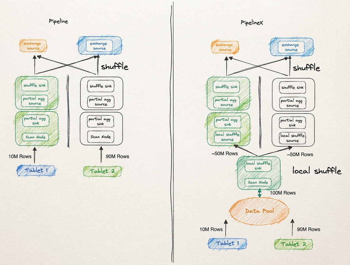 在 Doris 的新 Pipeline 引擎中,解决这一问题却很简单:通过添加 Local Shuffle 算子,对 PipelineTask 之间的数据进行重新分布,“数据倾斜”问题被全自动化地消解了。