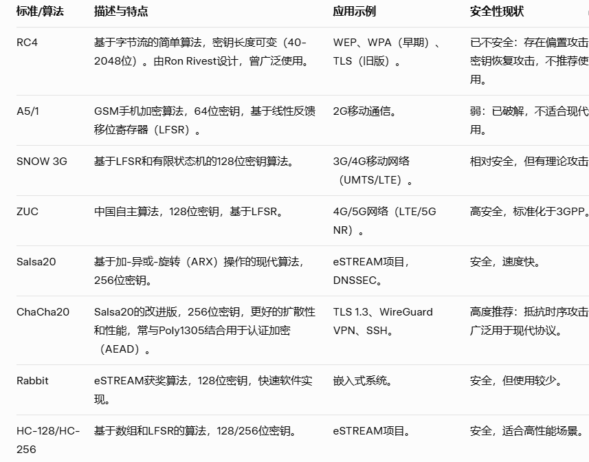 流加密有多个标准化算法,常用于无线通信、VPN、TLS等协议。以下是常见标准及其特点。