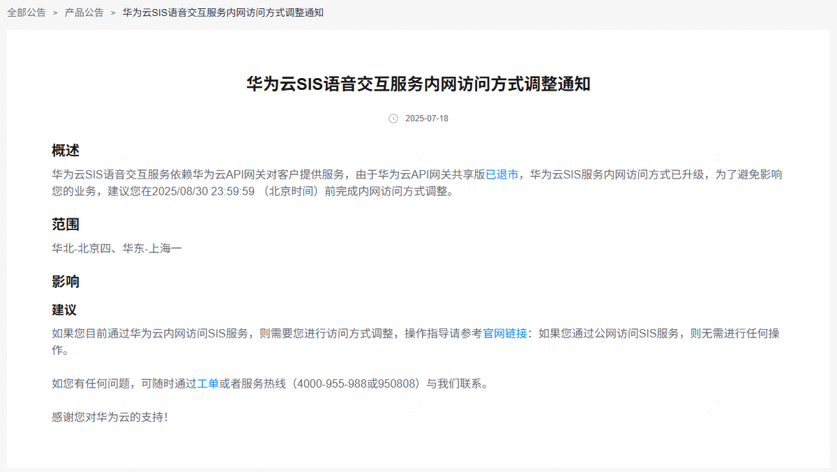 华为云SIS语音交互服务内网访问方式调整通知: https://www.huaweicloud.cn/notice/2025/20250718160827267.html