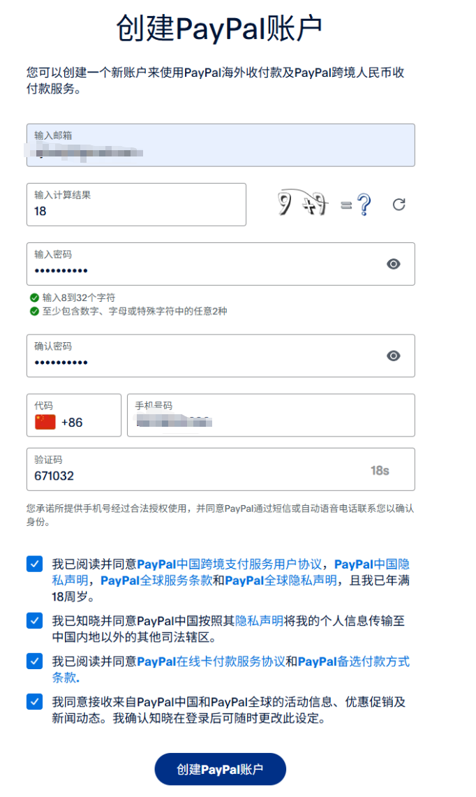 使用邮箱和手机号创建新账户。如曾注册过PayPal,需使用新邮箱完成申请。