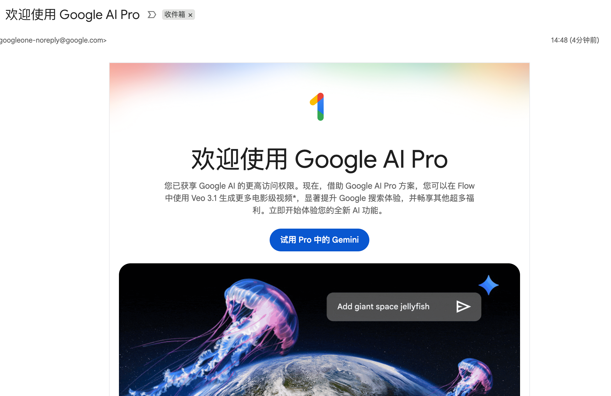 收到这个邮件,还是很激动的,毕竟花点小钱就可以用到1年的Gemini3和Nano banana了,非常划算。
