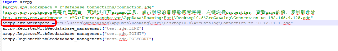 acrpyRegisterWithGeodatabase.py文件,将上一步复制的内容粘贴到以下位置,保存文件。