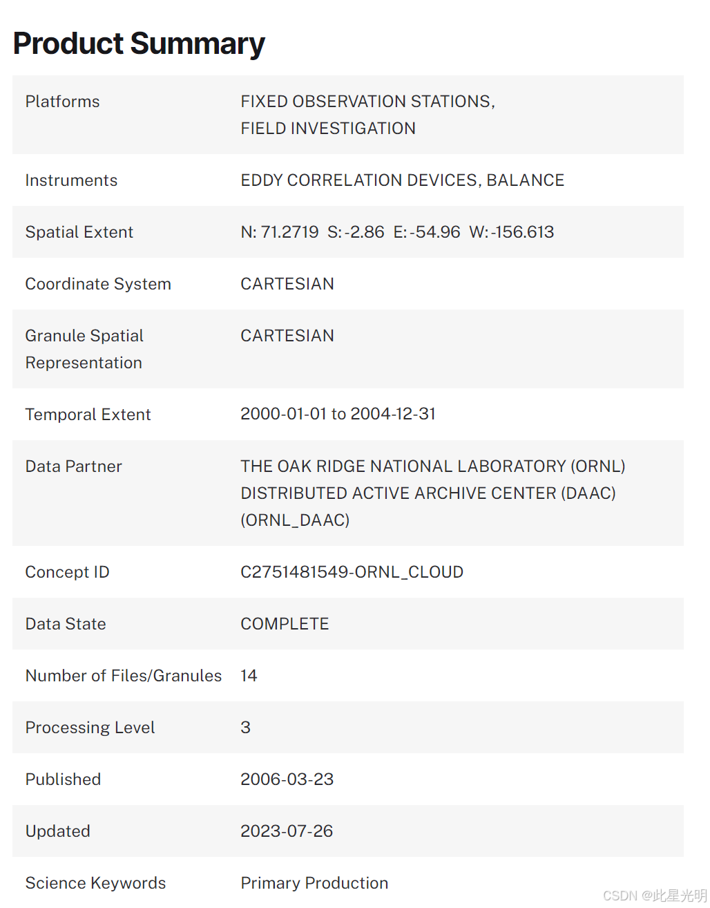 项目背景:来自 MODIS(美国国家航空航天局地球观测系统 (EOS) 卫星 Terra 上的中分辨率成像光谱仪,反射率数据用于生成多种科学产品,包括土地覆盖、叶面积指数 (LAI)、总初级生产力 (GPP) 和净初级生产力 (NPP)。 BigFoot 项目的总体目标是验证这些产品的有效性。为此,BigFoot 项目结合了地面测量数据、高分辨率遥感数据以及生态系统过程模型,在代表不同生物群落的九个通量塔站点开展研究,以评估生态系统特征的时空格局对 MODIS 产品的影响。BigFoot 项目对每个站点二氧化碳通量塔周围 7×7 公里(49 个 MODIS 像素)的区域进行了表征。我们收集了与陆地碳循环相关的生态系统结构和功能特征的多年原位测量数据。我们的采样设计使我们能够考察这些特征的尺度和空间格局、MODIS 产品的年际变化和有效性,并提供了基于实地的通量塔覆盖区域的生态特征描述。BigFoot 项目由 NASA 陆地生态计划资助。