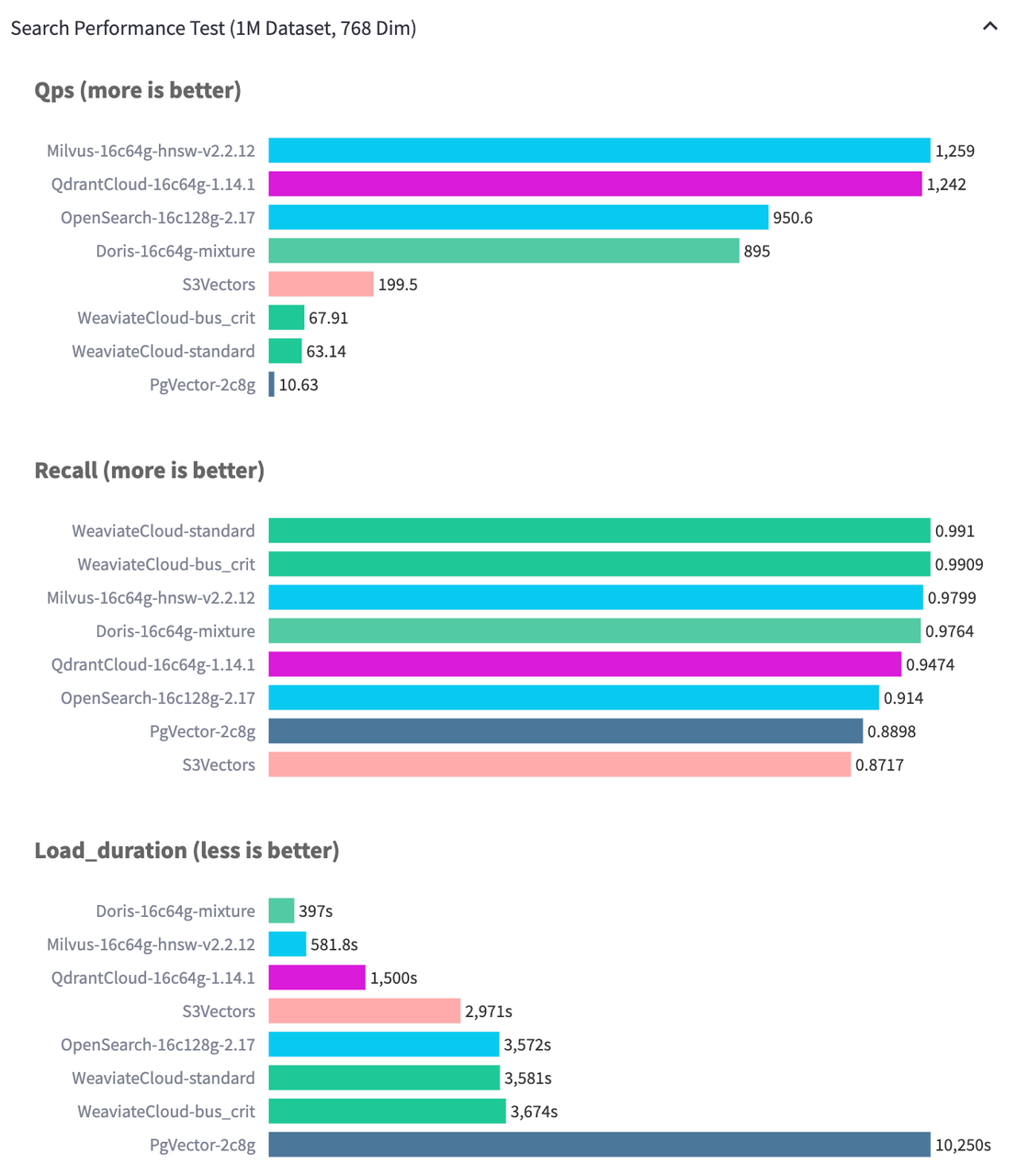 Apache Doris 的目标并非追求单一指标的极限表现,而是在真实生产负载下,实现性能的均衡性、系统稳定性与架构可扩展性。本次测试将围绕这一目标展开,所用工具为 ZillizTech 开源的向量搜索 BenchMark