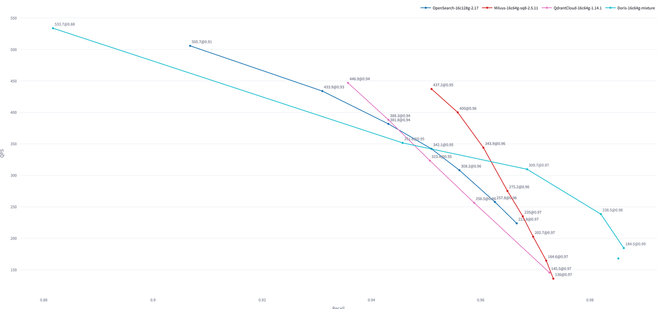在 Performance768D10M 数据规模上,当召回率要求高于 95% 时,Apache Doris 的 QPS 表现优于 OpenSearch 与 Qdrant。此结果为默认配置下的开箱性能,未针对 Segment 文件数量等进行专项调优。