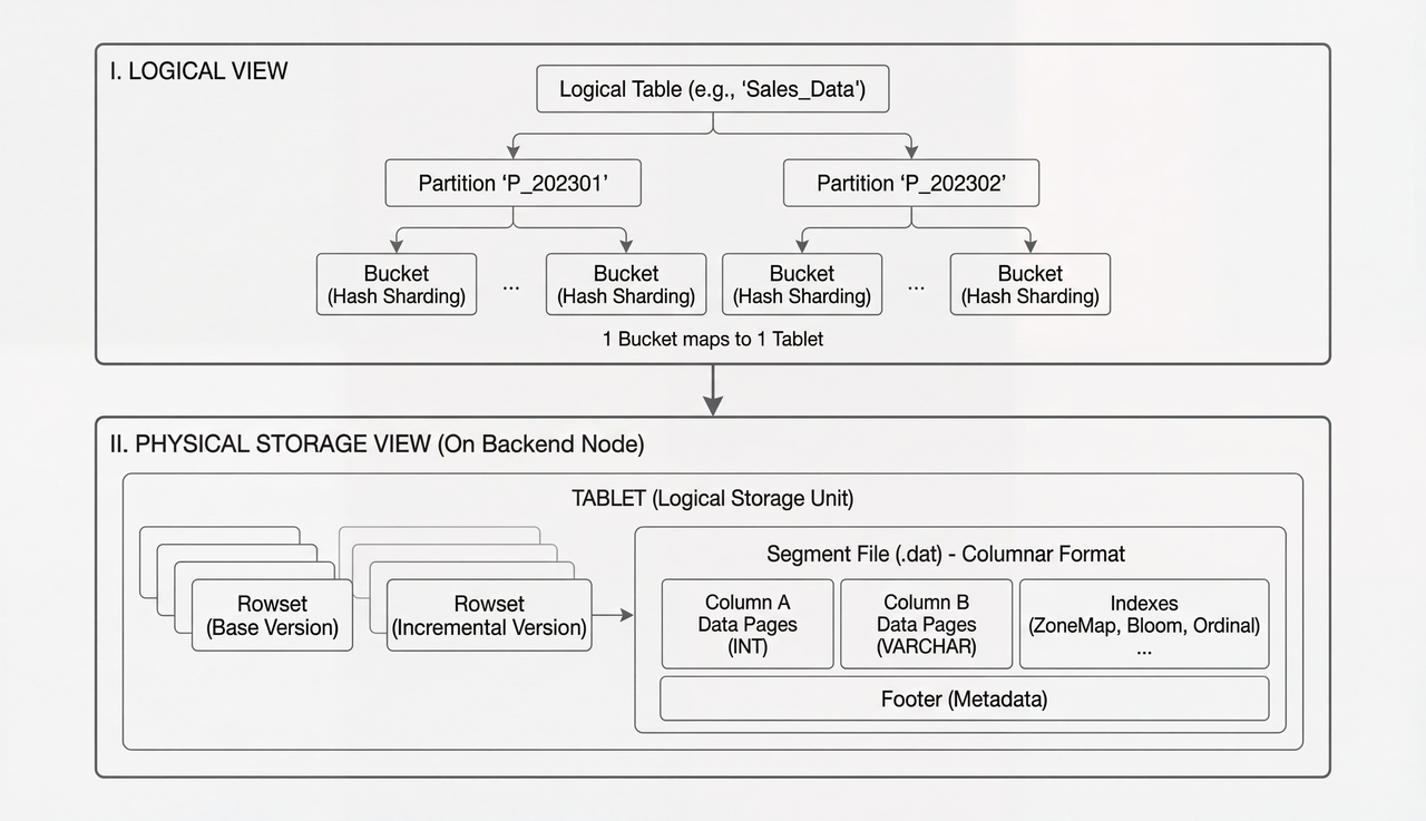 Apache Doris 将逻辑表在内核层拆分为多个 Tablet。每次数据导入会生成一个 Rowset,每个 Rowset 又包含若干 Segment,而 ANN 索引正是在 Segment 粒度上构建与使用的。这一设计将“全表数据量”与“索引超参数”解耦,用户只需根据单批次导入的数据规模来设定参数,无需因数据总量增加而反复重建索引。