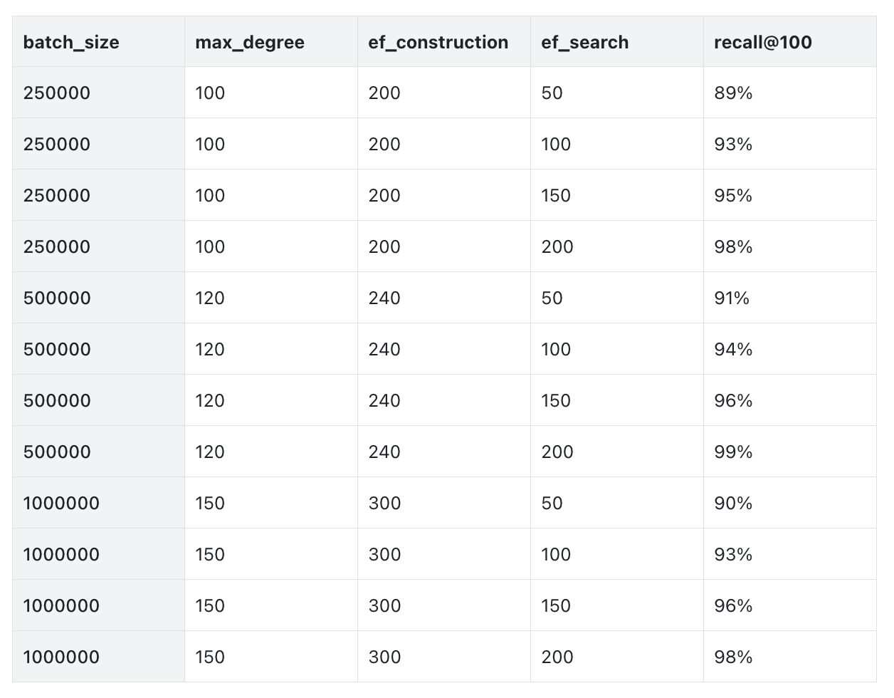得益于 Apache Doris 的分片架构下,索引参数可稳定在合理的规模区间,不受全表数据总量增长的影响。换言之,索引超参数的设置只需基于单个 Tablet 单次导入的数据行数。即便集群规模扩大,也仅需根据机器与分桶数量相应调整批次大小(batch size)即可。