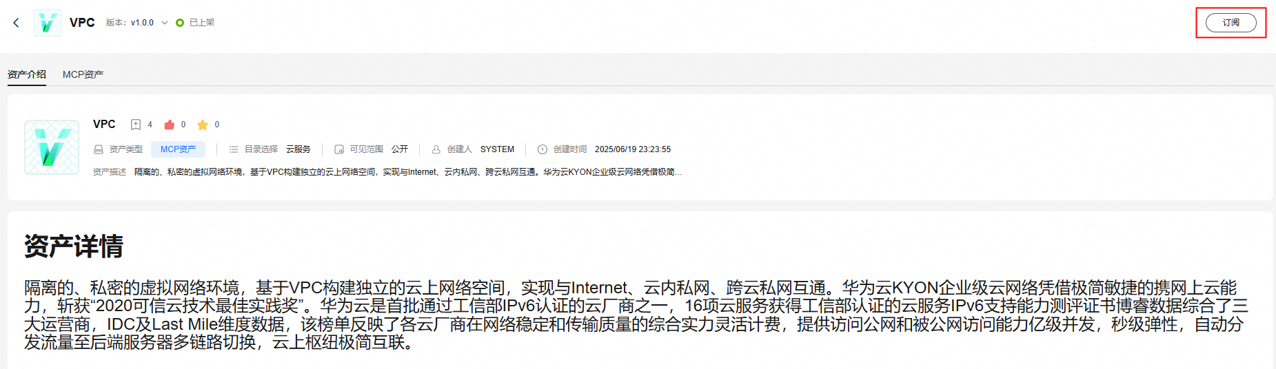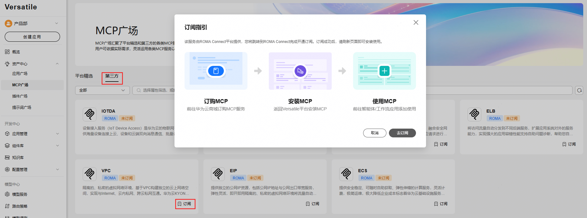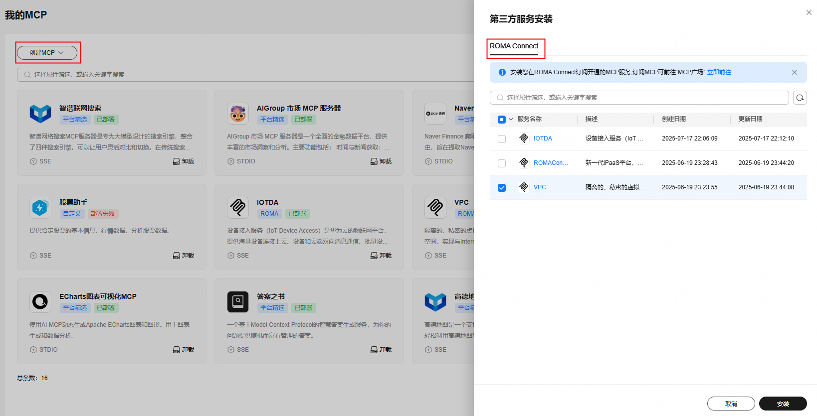· MCP广场支持订阅ROMA Connect的MCP服务集成至资产中心-第三方展示;支持工具调测,在智能体中可以添加使用。