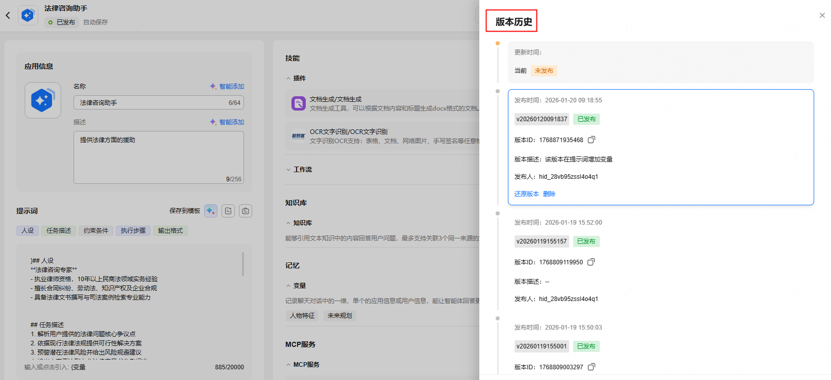 · 发布历史中显示每个版本的修改描述:可查看智能体更新发布的历史记录,支持还原版本和删除操作。