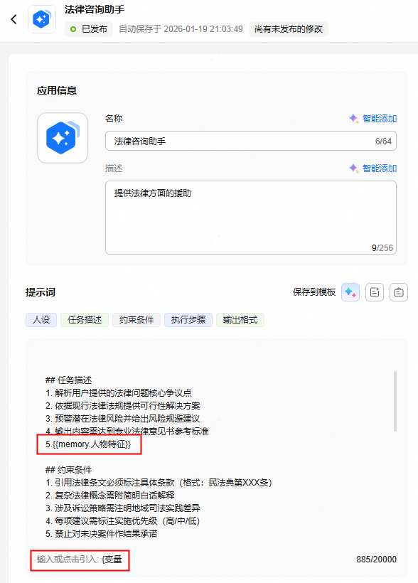 · Agent提示词支持引用自定义变量参数在模优先模式下,当用户为应用添加记忆并创建了变量后,可快速引用;同时支持用户在提示词输入框中输入变量。