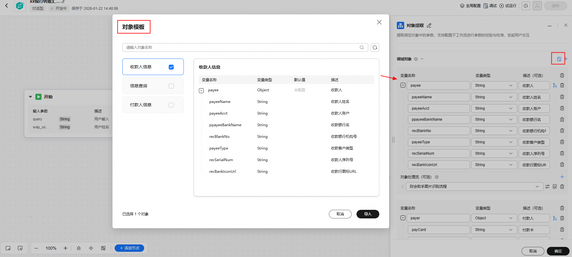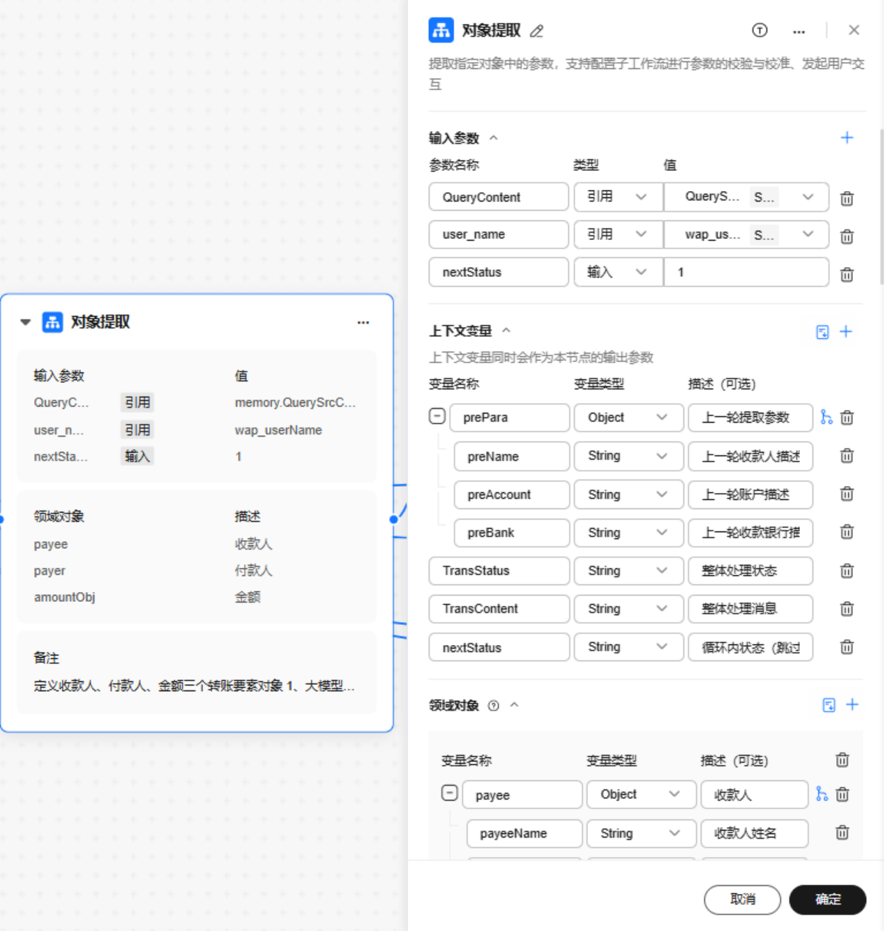 · 新增对象提取节点:工作流支持参数提取节点,用于提取指定对象中的参数。 可配置子工作流以进行参数的校验与校准,并发起用户交互。