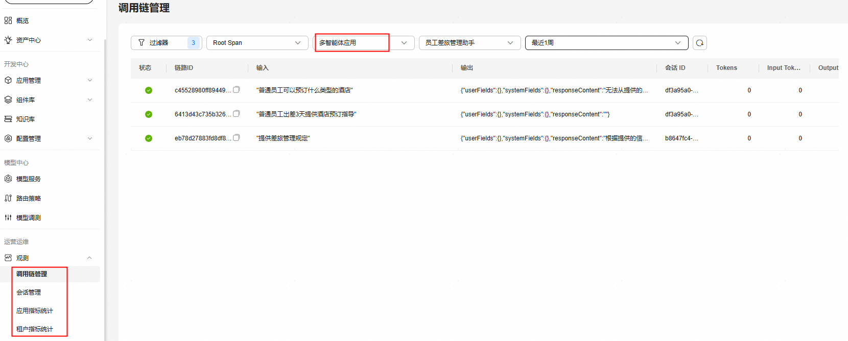 · 观测支持上报和统计多智能体的数据信息。包括调用链管理、会话管理、应用指标统计、租户指标统计。