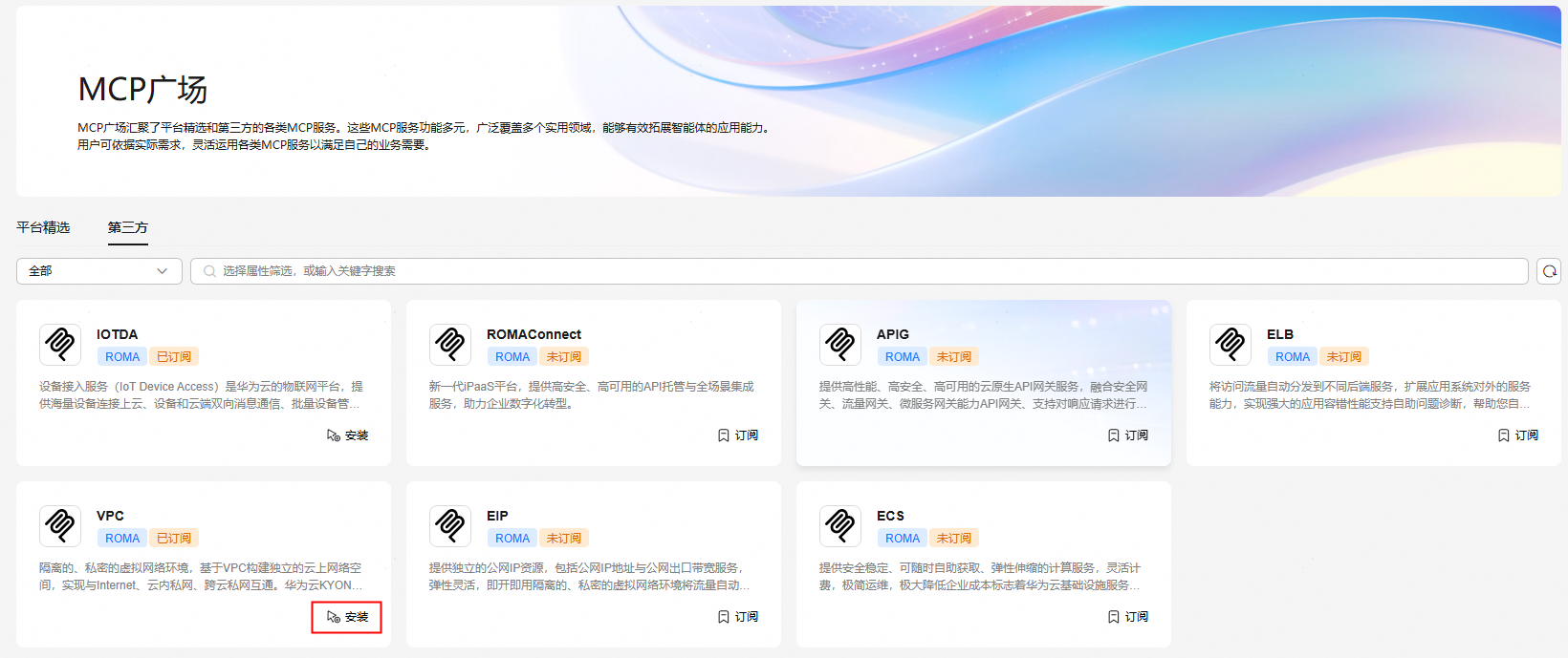 · MCP广场支持订阅ROMA Connect的MCP服务:集成至资产中心-第三方展示;支持工具调测,在智能体中可以添加使用。