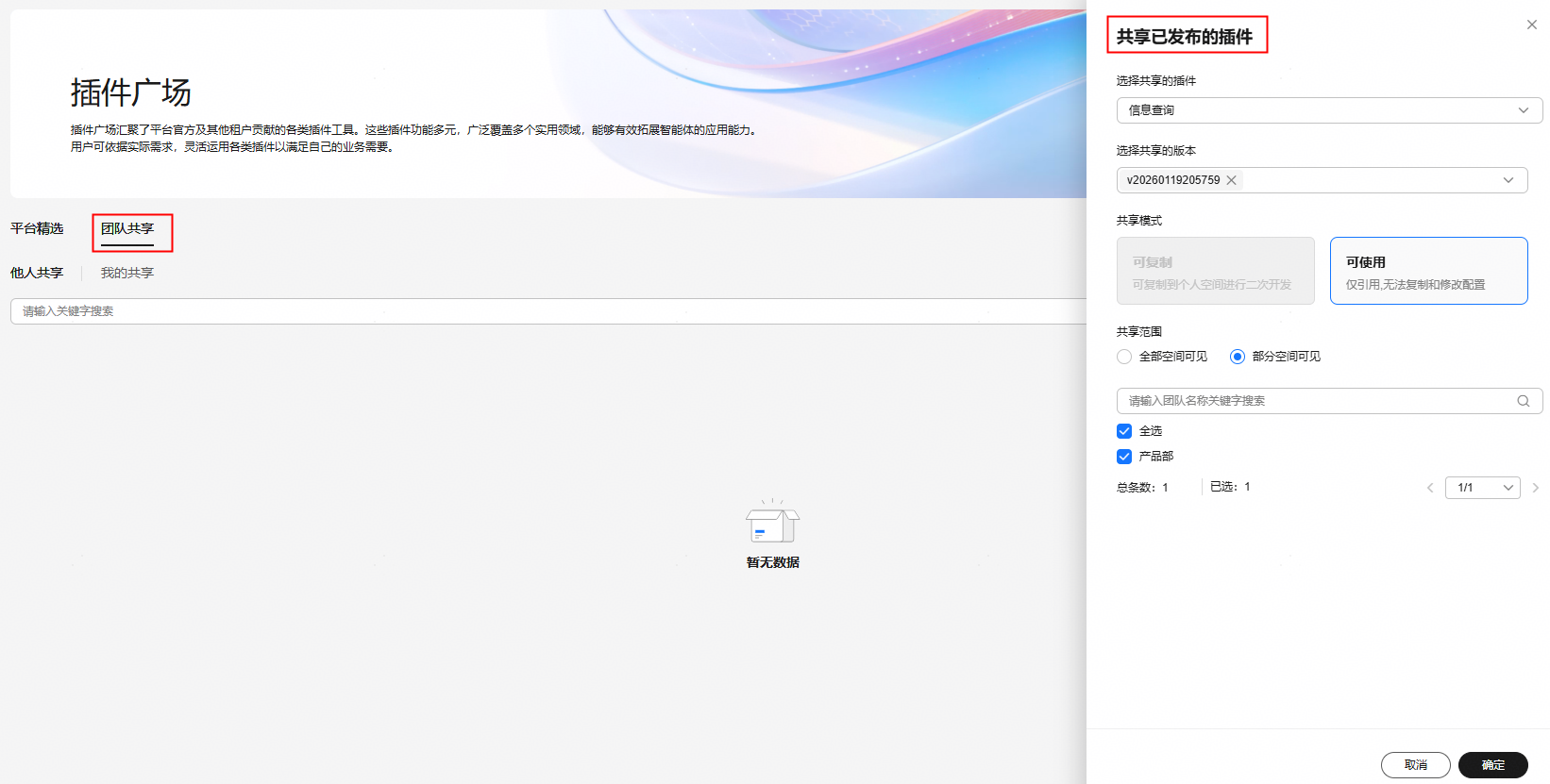 业务价值:由用户创建的应用、插件等资源,可在当前租户下的所有团队间共享使用,便于团队多成员快速调用,提升协作与效率。(备注:不支持跨租户共享)