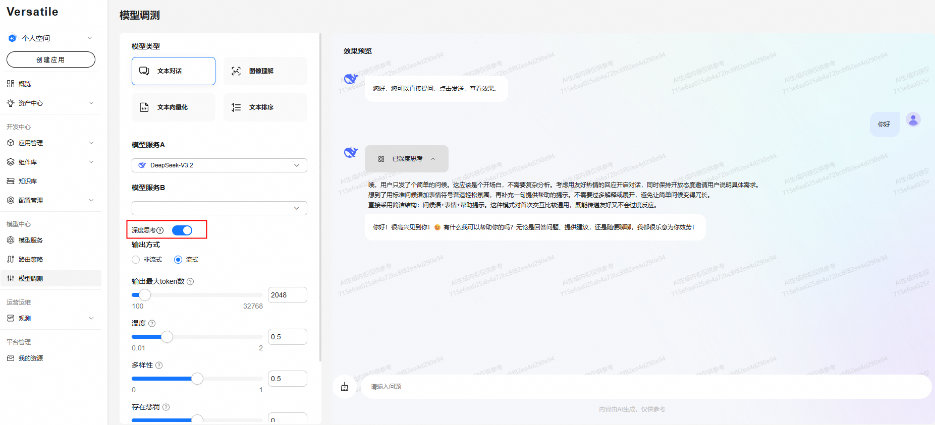· 模型配置支持深度思考:功能开启时,大模型将首先进行深入的思考和推理,通过逐步拆解问题、梳理逻辑,生成一段详细的思维链内容,并在调试界面展示。