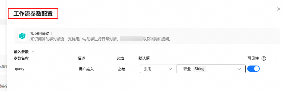 · Agent引用工作流、插件时支持参数配置:可配置参数默认值对值比较稳定的参数,例如密钥等,支持隐藏可见性