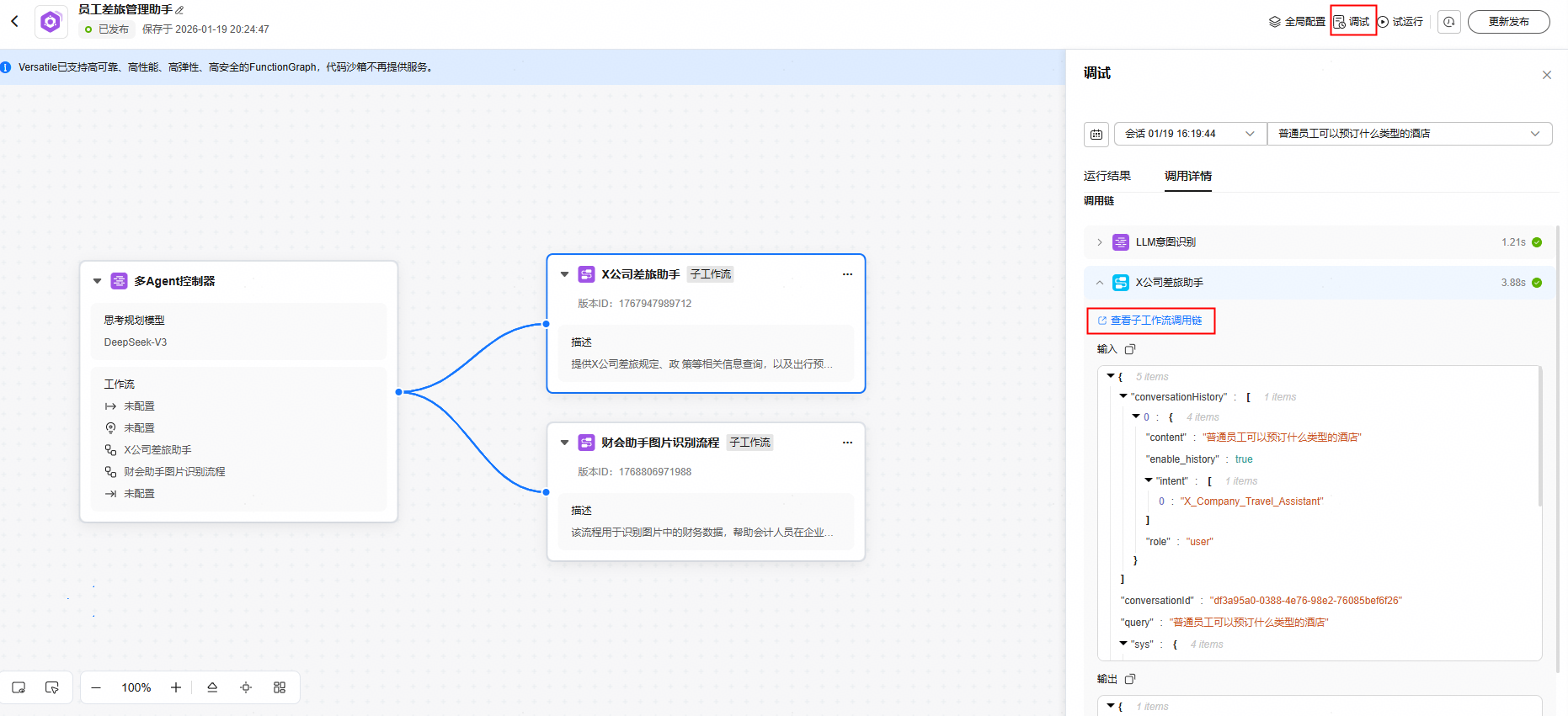 业务价值可查看试运行过程中的调试结果,直观了解多智能体的运行性能,便于开发者快速地追溯操作顺序并精确定位问题。