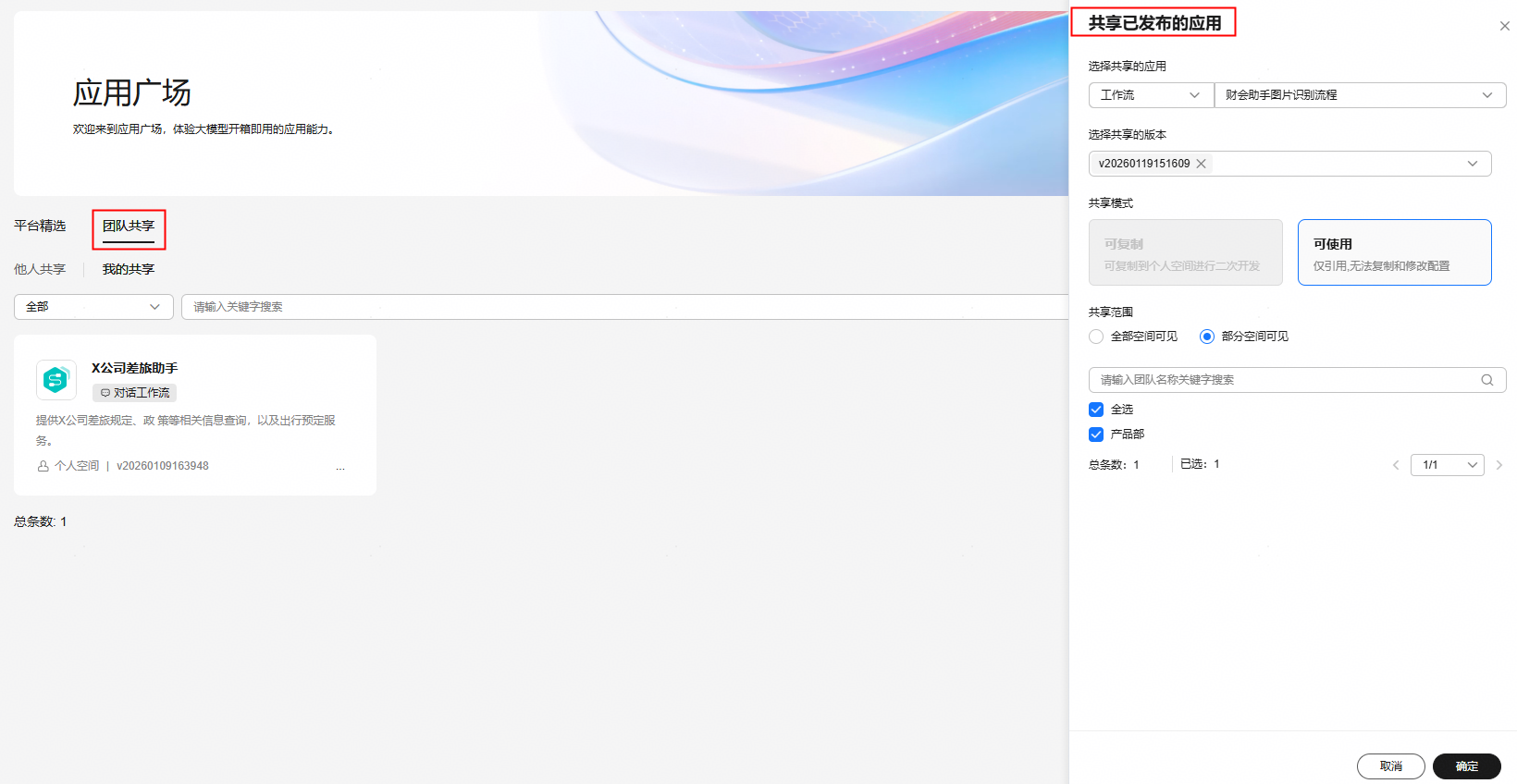 · 应用广场/插件广场支持团队共享能力,可设置共享模式和共享范围