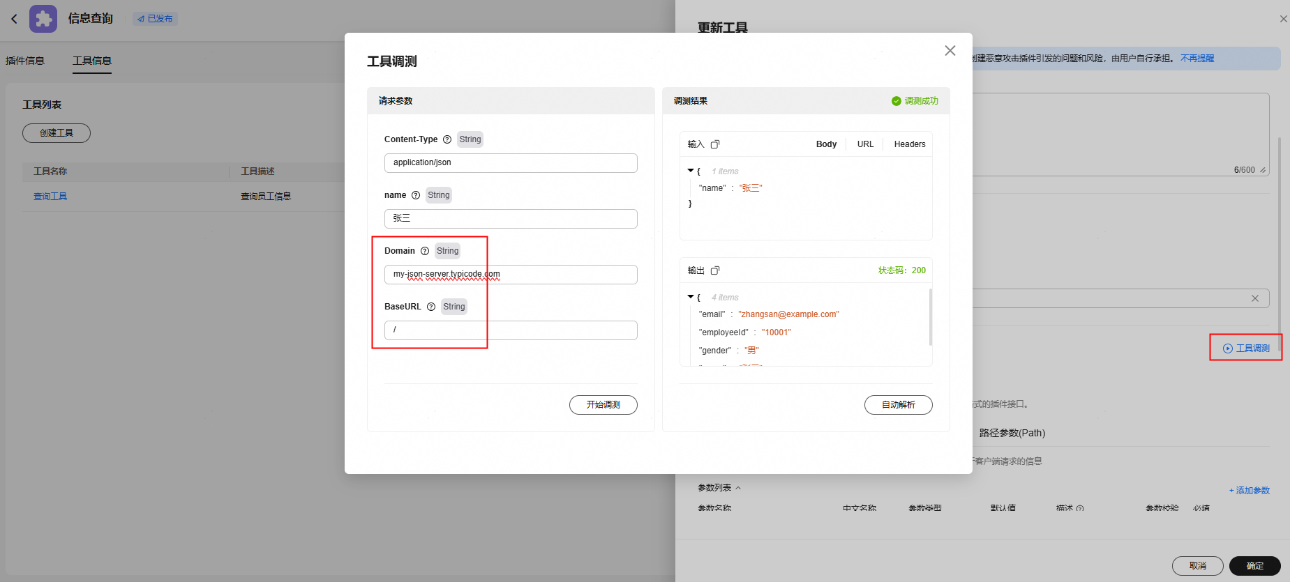 · 服务域名和基准URL支持定义变量值:添加变量后,可以在变量参数部分设置参数的描述;在工具调测时,可输入具体的参数值。