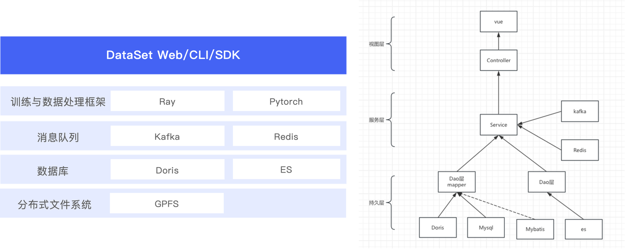 • 数据集管理系统:经过预处理的数据,汇入 基于 Apache Doris 构建的数据集管理系统(即本文核心) 。该系统是整个 AI 中台的关键,负责数据的版本化存储、管理与发布,为模型训练与测试提供数据支撑。