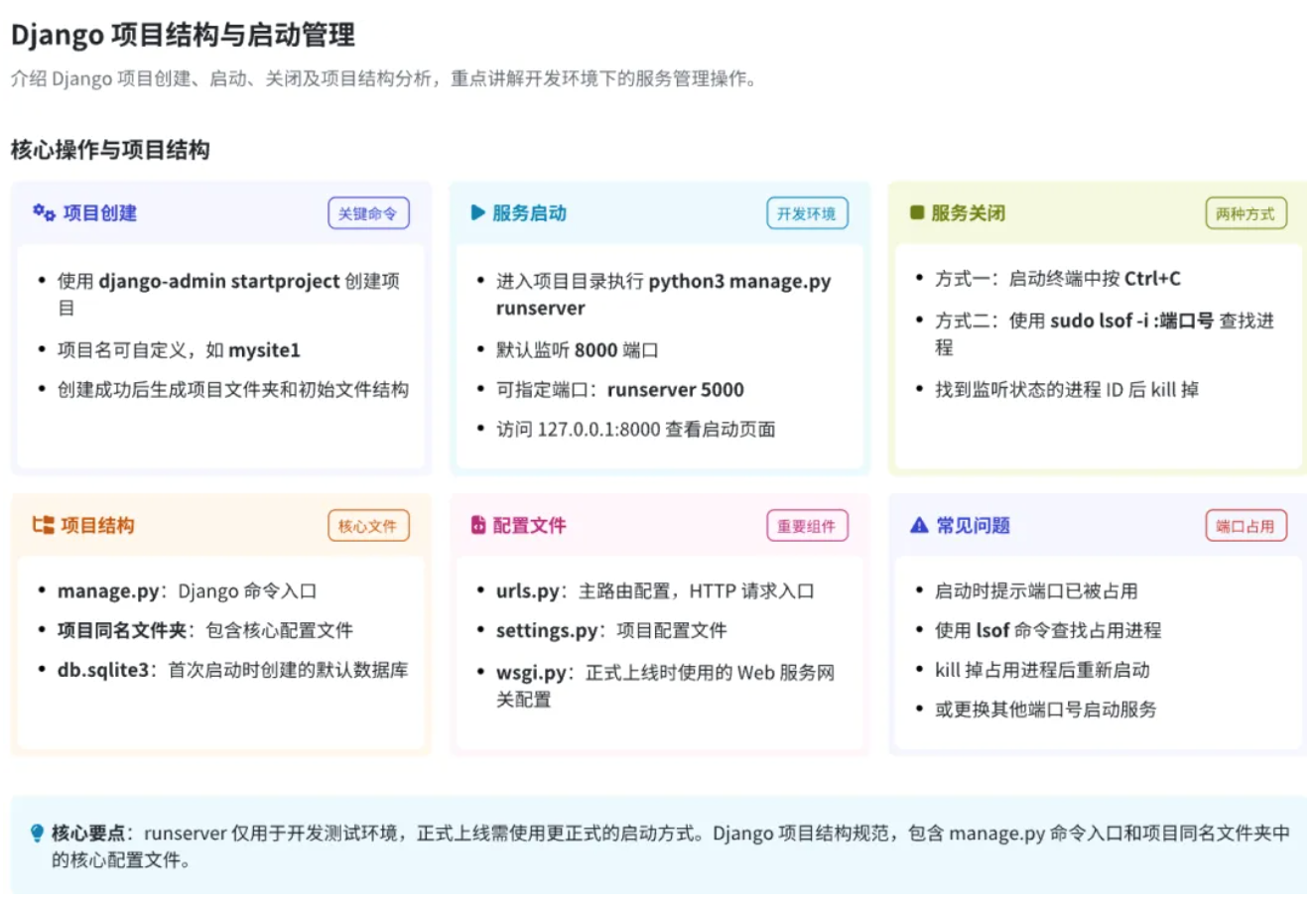 但这恰恰是 Django 的优势所在。 它不是一个“一个 .py 文件跑全场”的轻量框架,而是从第一天就把你拉进工程化开发的轨道。