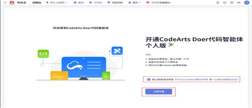 注:若为首次使用CodeArts代码智能体,会进入开通页面。需要勾选**“我已阅读并同意”后,单击“立即开通”**,等待套餐开通完成。