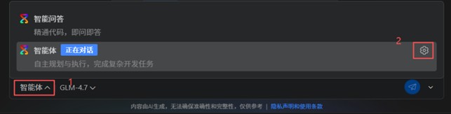在CodeArts代码智能体对话框下侧点Agent模式,在弹出的菜单最后侧点设置按钮。