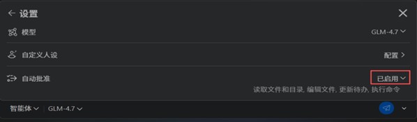 在设置界面,点自动批准右侧的下拉三角