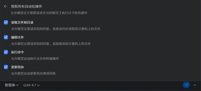 进入授权所有自动化操作界面,分别勾选读取文件和目录、编辑文件、执行命令、更新代办。。