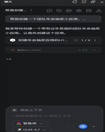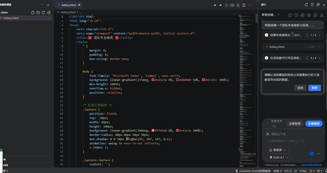 在CodeArts代码智能体对话框中输入“帮我创建一个团队年会抽奖小应用,要求界面美观,有过年氛围,并直接运行。”,使智能体自动构建团队抽奖应用,并运行程序: