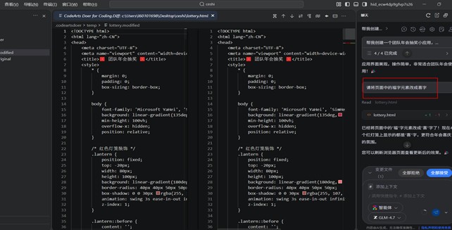 也可以根据自己需求,要求智能体对应用进行多次修改,比如输入:“请将页面中的福字元素改成喜字”