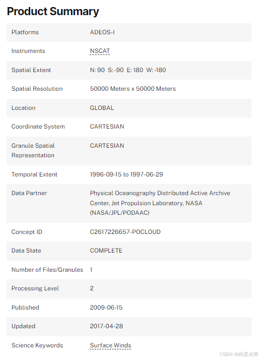 美国国家航空航天局散射计(NSCAT)二级海洋风矢量数据以 50 公里风矢量网格(WVC)幅宽呈现,包含每日上升和下降轨道的数据。风矢量的精度在 2 米/秒(矢量速度)和 20 度(矢量方向)以内。受降雨污染区域的风矢量数据无效;数据中不包含降雨标记和降水信息。数据中会标记缺失、模糊或受陆地/海冰污染的测量值。风的计算采用 NSCAT-2 模型函数。这是最新版本,代表了校准、验证和科学数据处理的最终阶段,该阶段于 1998 年 11 月由喷气推进实验室(JPL)NSCAT 项目完成;风矢量的处理采用 NSCAT-2 地球物理模型函数。