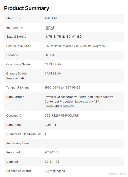 【摘要】 NSCAT Level 3 Daily Gridded Ocean Surface Wind Vector Browse Images (JPL)简介本数据集提供美国宇航局散射计(NSCAT)3 级每日网格化海洋风矢量的浏览图像,升轨和降轨的风矢量空间分辨率均为 0.5 度;相邻轨道重叠处的风矢量取平均值。这是最新版本,代表了校准、验证和科学数据处理的最终阶段,该阶段于 1998 年 11...
