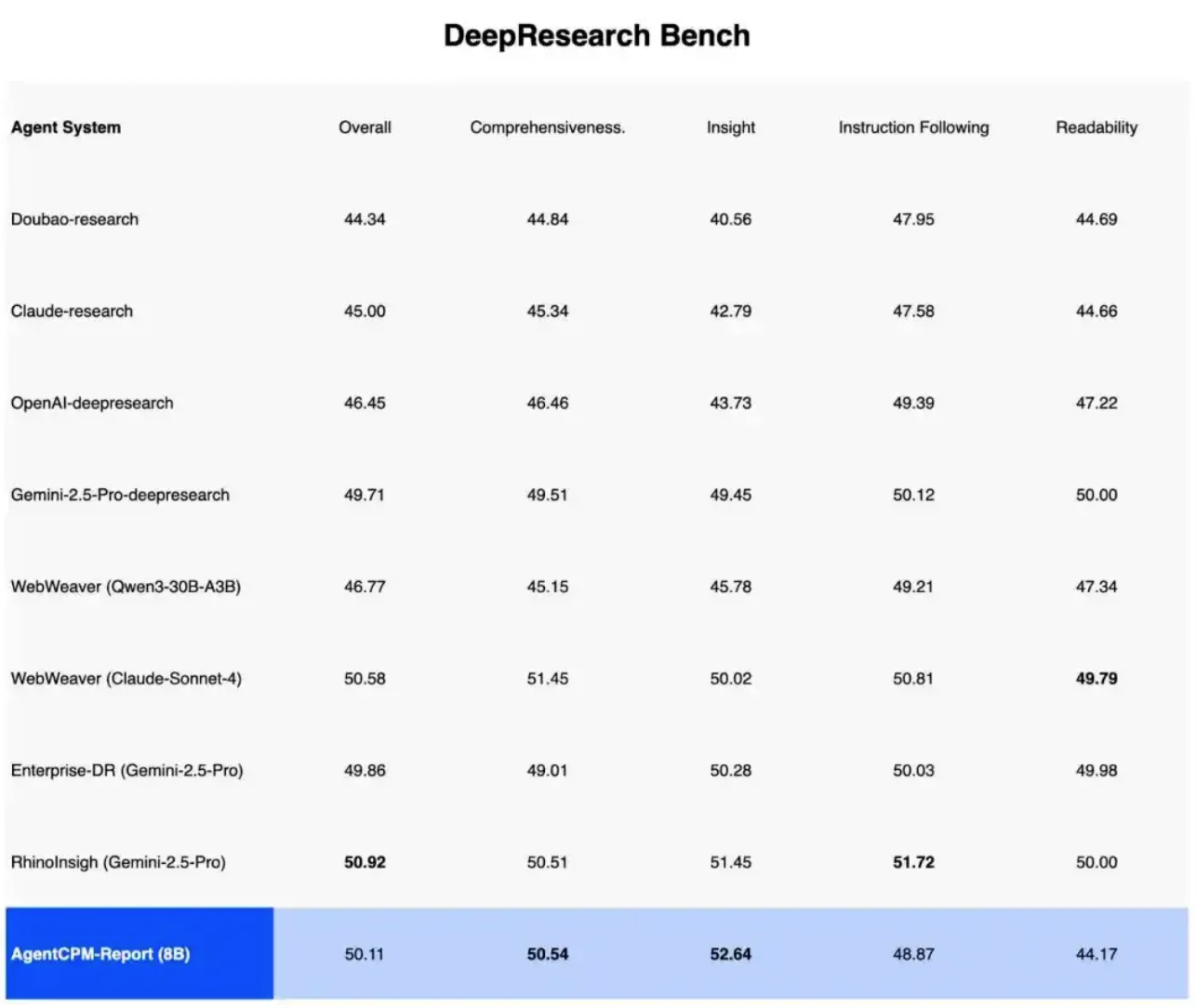 在多个主流深度调研评测基准中,AgentCPM-Report 的成绩相当激进: