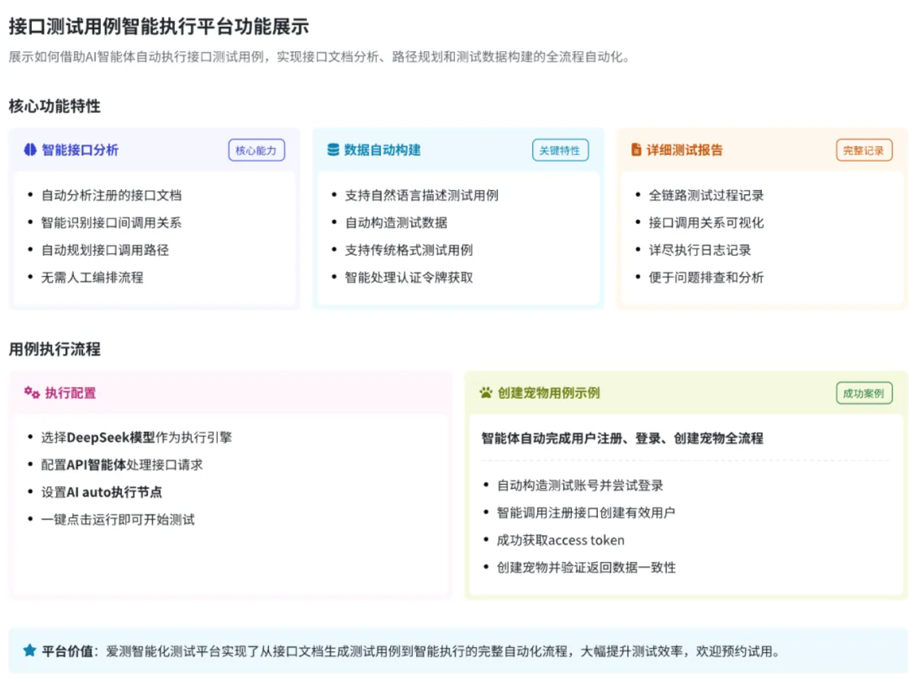 而这次演示的视频,展示的正是爱测平台接口自动化测试智能体,在真实接口测试场景下,是如何自己理解接口文档、自己规划调用路径、自己构造测试数据,并最终完成完整校验的。