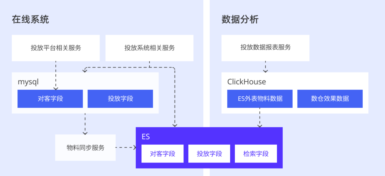 早期存储架构中,物料数据由 MySQL、Elasticsearch 协同存储;效果数据主要存储与 Clickhouse 中。