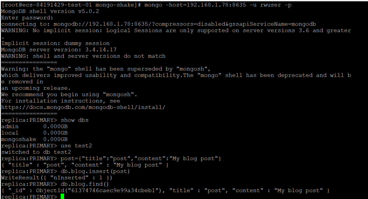 [2021/09/07 19:23:30 CST] [INFO] New session to mongodb://rwuser:***@192.168.1.78:8635 successfully