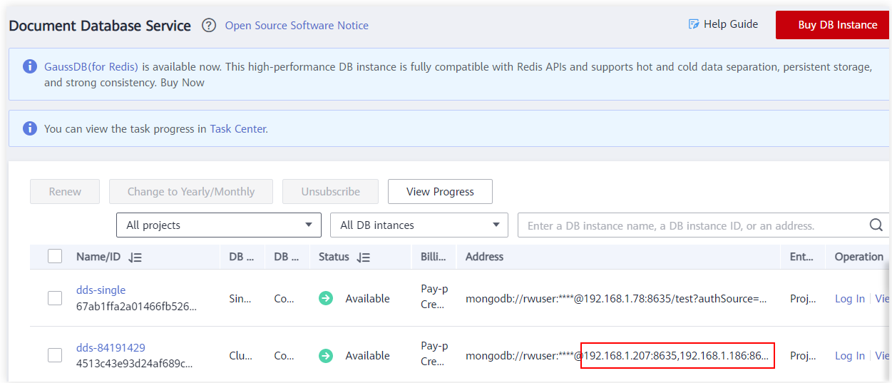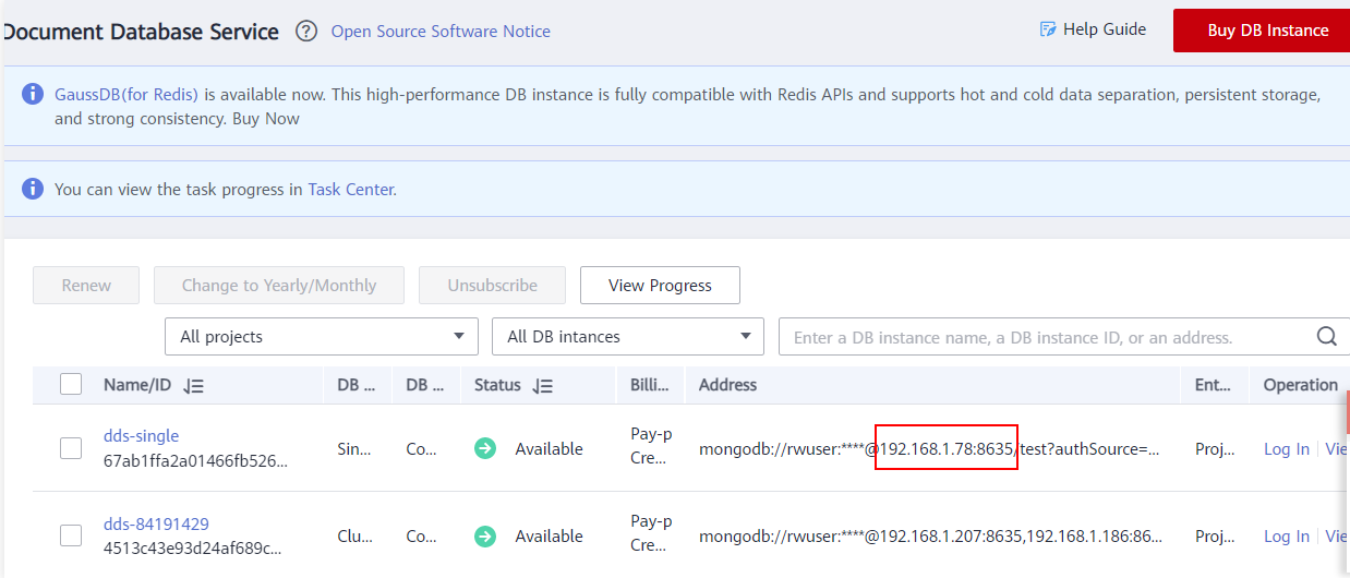 • 登录华为云控制台,您将看到新的DDSinAvailable状态。