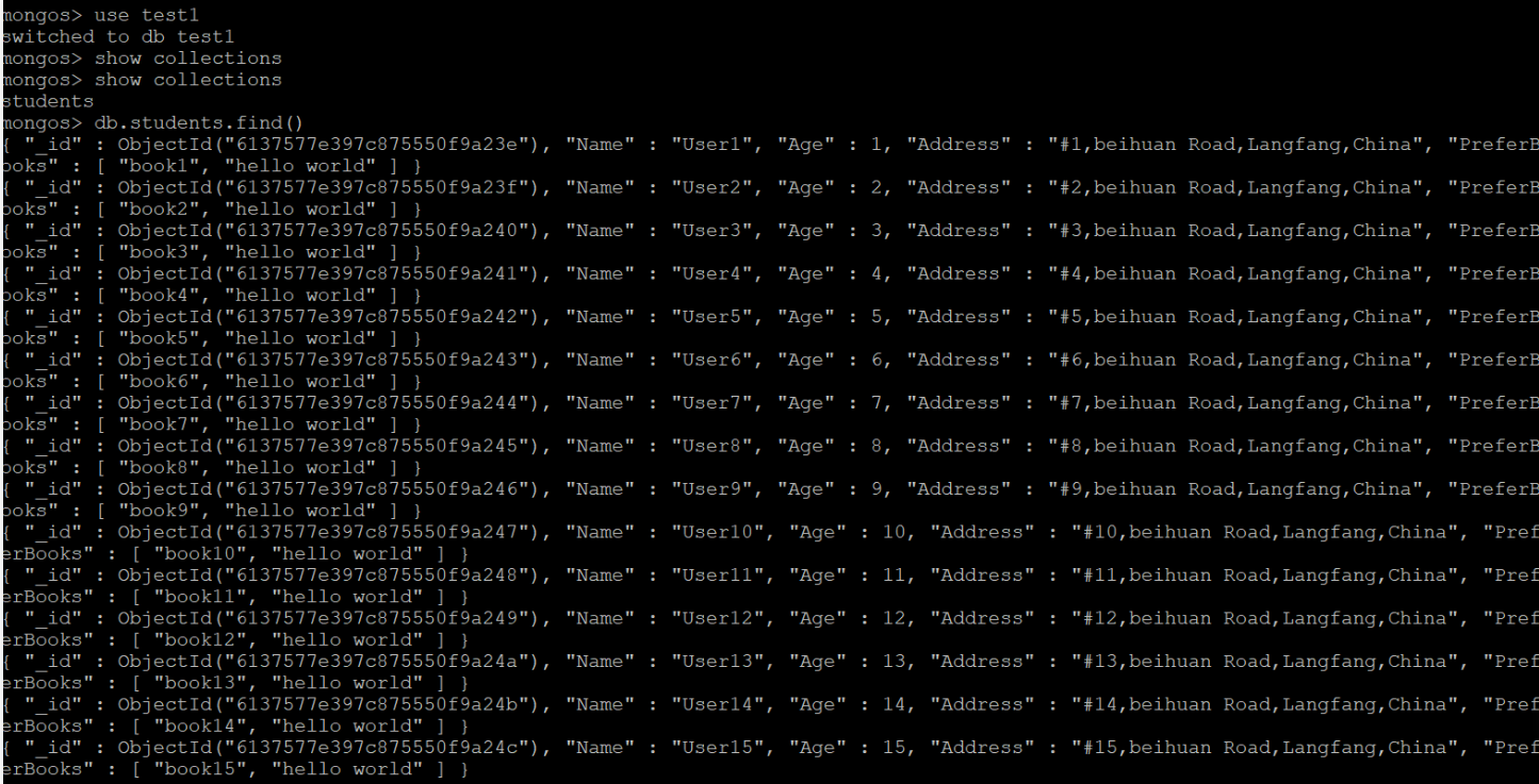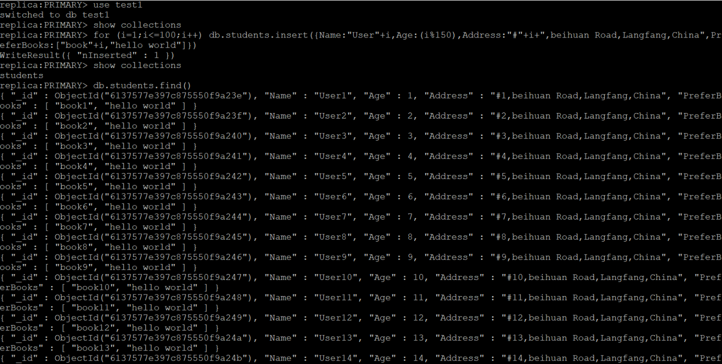 >for (i=1;i<=100;i++) db.students.insert({Name:"User"+i,Age:(i%150),Address:"#"+i+",beihuan Road,Langfang,China",PreferBooks:["book"+i,"hello world"]})